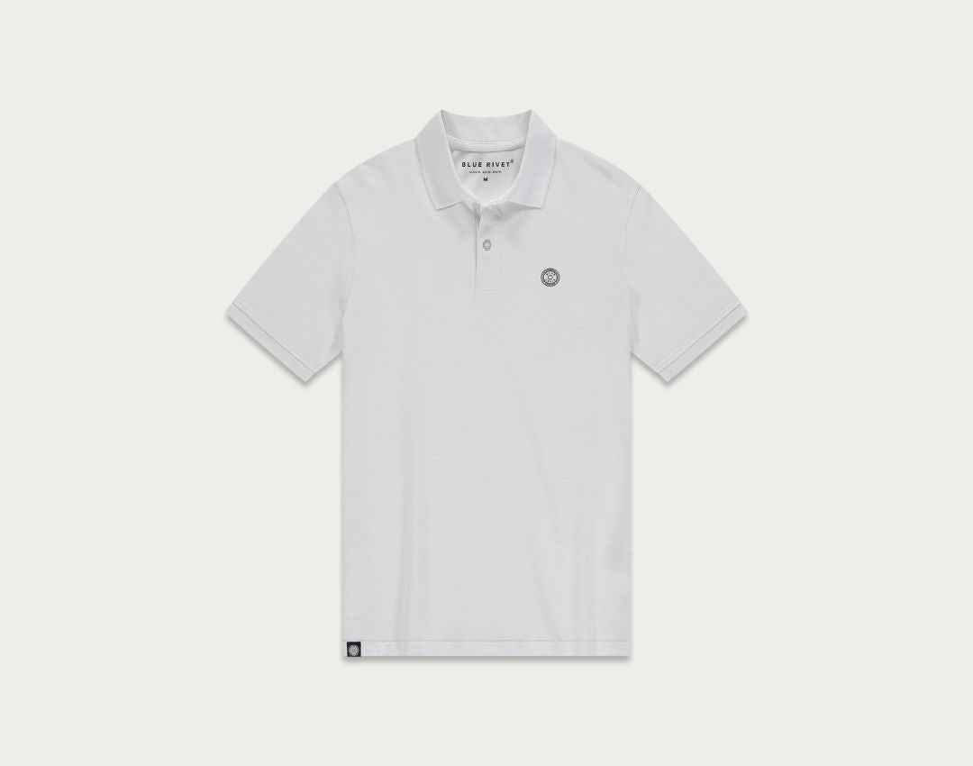 • Een wit poloshirt van Blue Rivet Jeans, bekend als The N01 Polo White, met korte mouwen en een klein cirkelvormig embleem met patroon op de linkerborst. Dit shirt heeft een kraag en twee knopen. Binnenin staat op het label BLUE RIVER simple. solid. style. M.