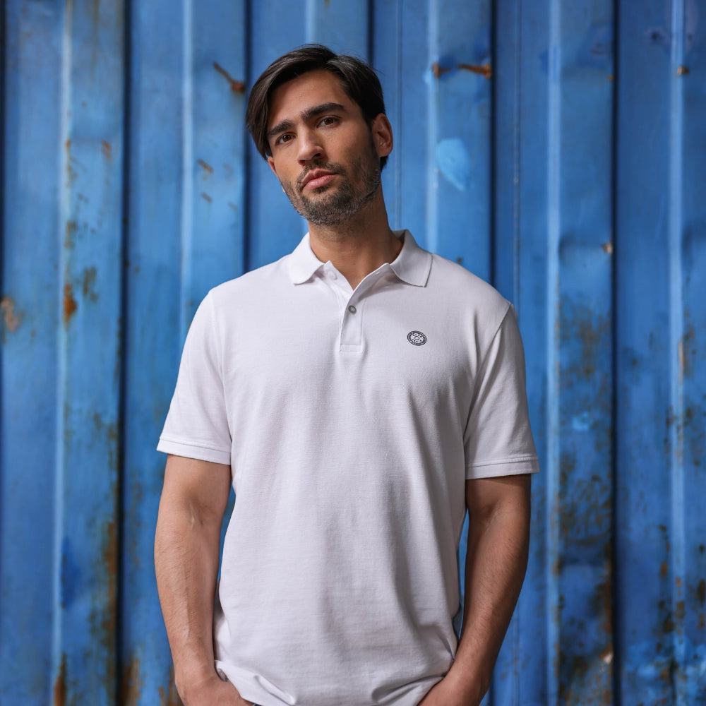 • Een man draagt The N01 Polo White van Blue Rivet Jeans, met korte mouwen en een klein logo op de borst, staat tegen een lichte achtergrond. Zijn gezicht is gedeeltelijk zichtbaar en hij kijkt opzij.