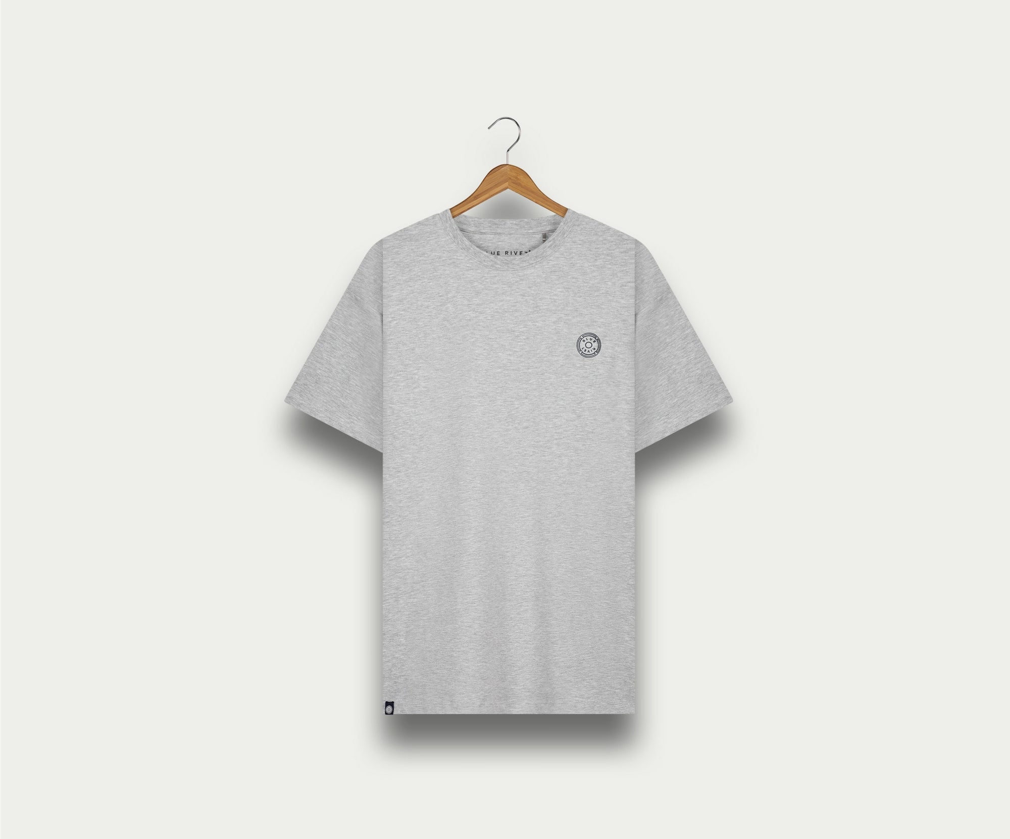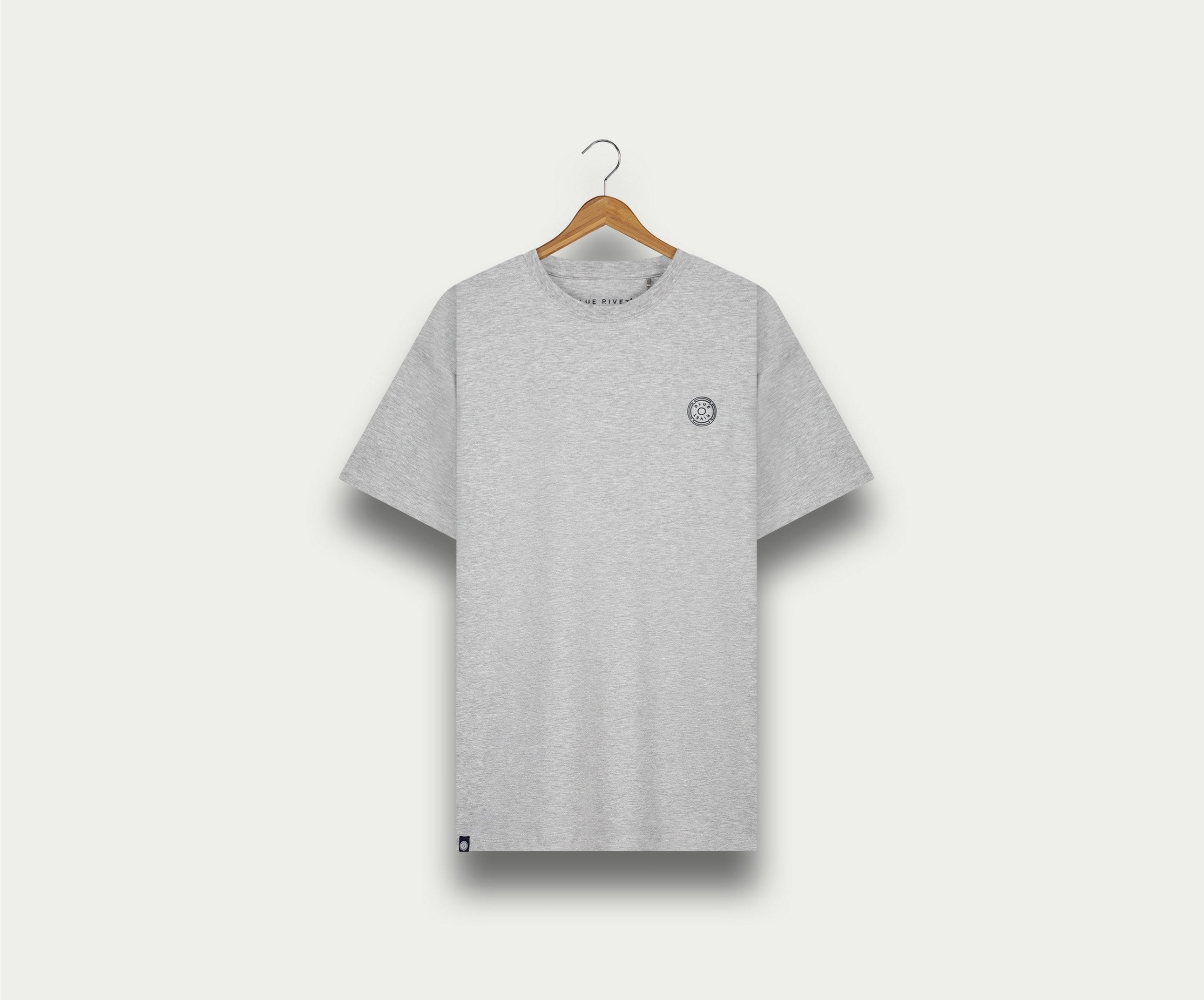 • De N01 Tee Grey Melee van Blue Rivet Jeans, ontworpen in een normale pasvorm, hangt aan een houten hanger tegen een lichtgekleurde achtergrond. Het heeft een klein rond logo op de linkerborst.