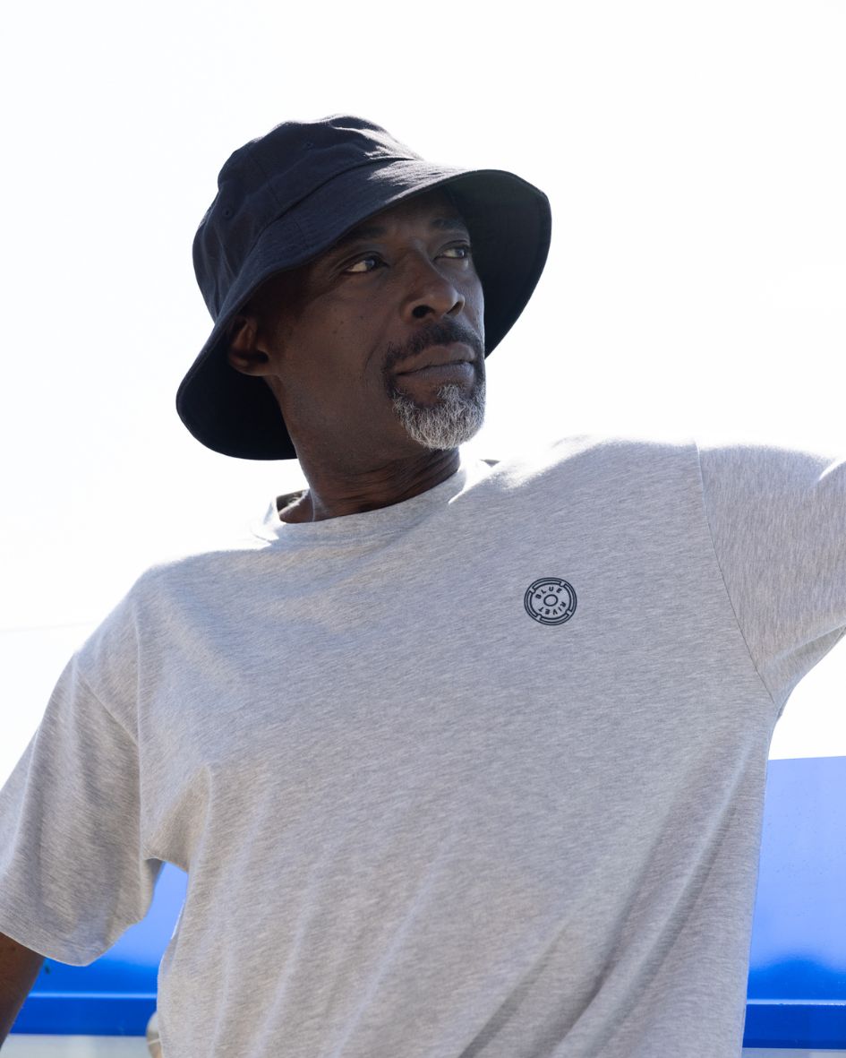 • Een man die een The N01 Tee in Grey Melee draagt, staat tegen een effen achtergrond, gecombineerd met Blue Rivet Jeans en witte sneakers. Zijn korte, golvende haar complimenteert zijn ontspannen houding terwijl hij zelfverzekerd in de camera kijkt.