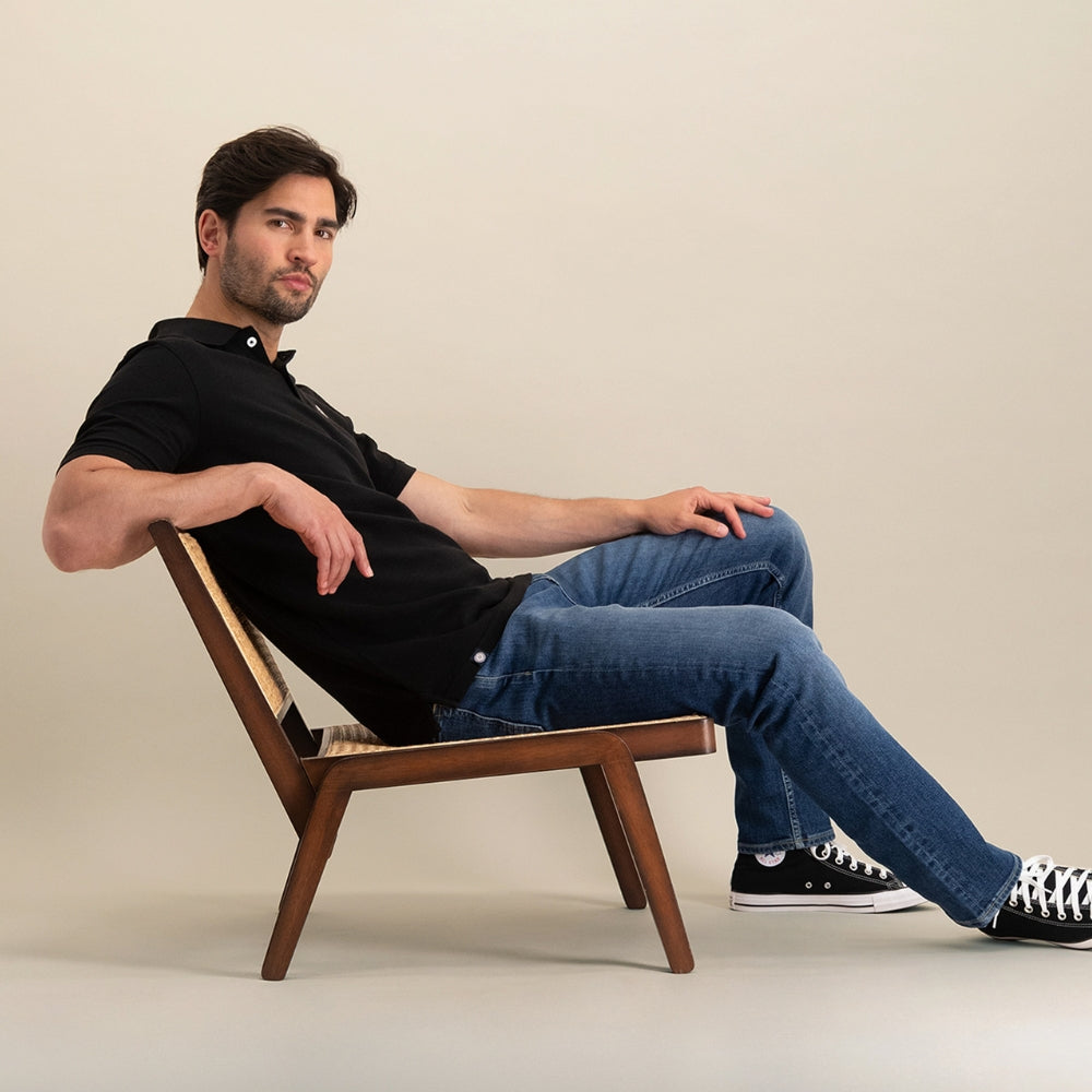 • Een man zit op een zwarte kruk tegen een effen beige achtergrond, en straalt zomerse chic uit. Hij draagt The N01 Polo Anthracite, een klassieke polo van biologisch katoen, gecombineerd met de blauwe denim van Blue Rivet Jeans en stijlvolle zwarte sneakers. Met zijn armen over elkaar kijkt hij recht in de camera, wat een moeiteloze stijl uitstraalt.